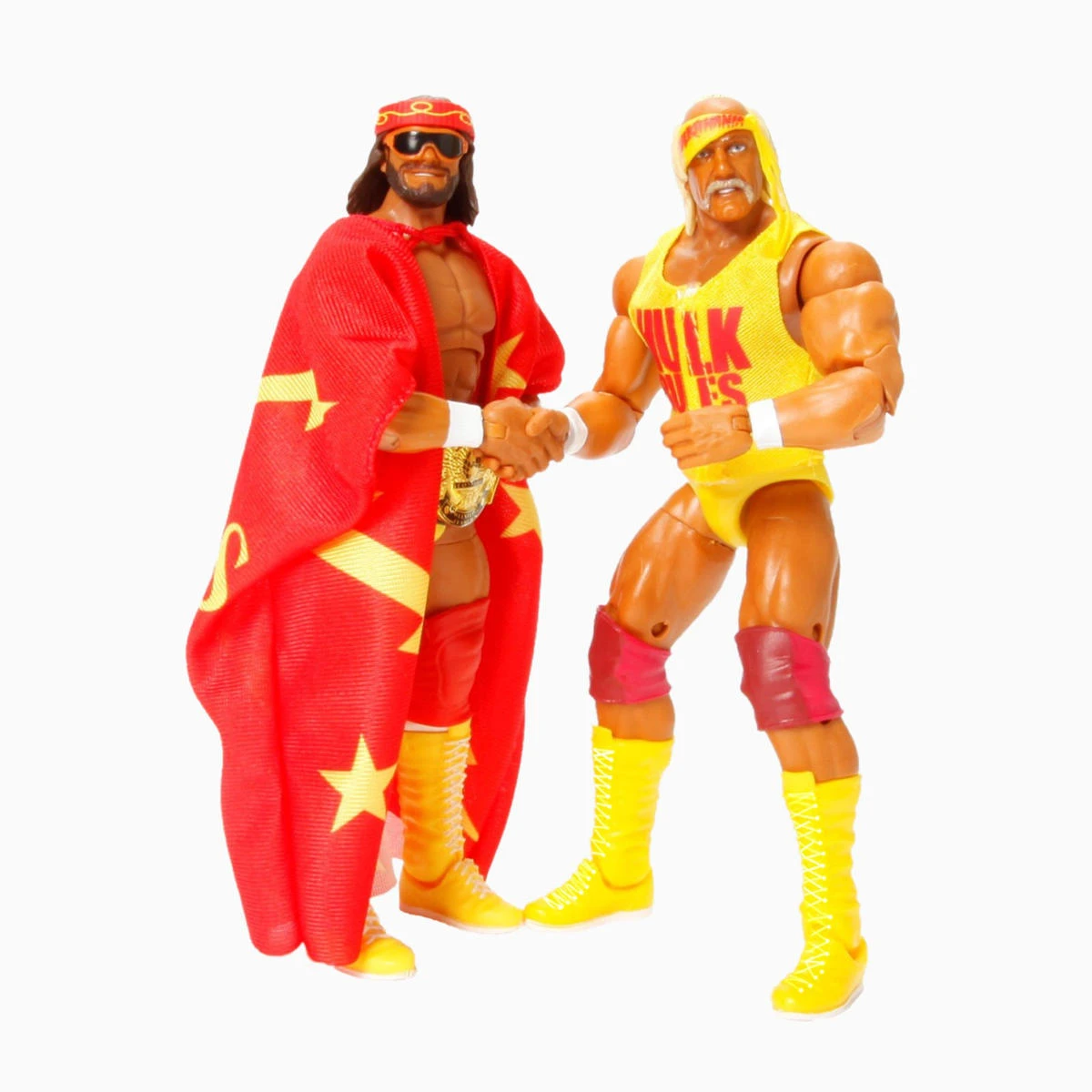 Accessories Include Alternate Hulk Hogan and Macho Man heads, 2 sets of alternate hands including, a set of hands to recreate the infamous Mega Powers handshake, Macho Man Bandana, Sunglasses & Fabric MegaPowers Robe as well as the Winged Eagle Championship Title Belt!